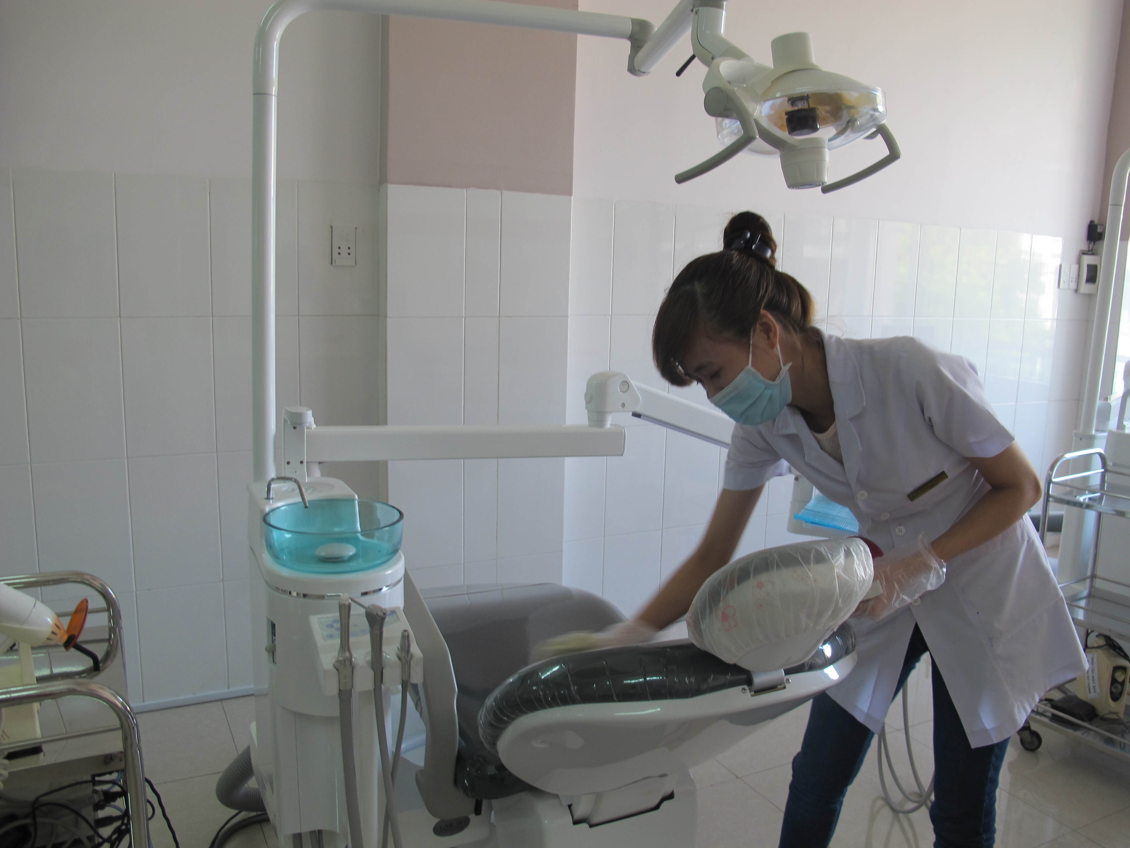 Phụ tá lau dọn ghế sau điều trị