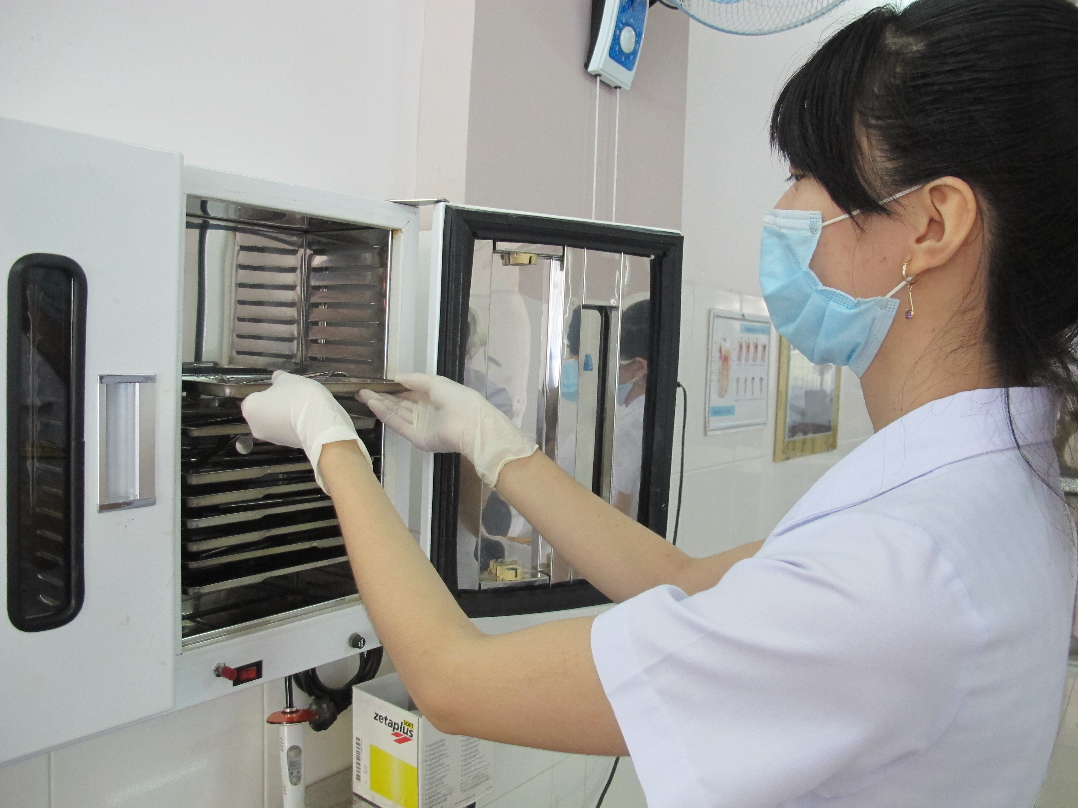 Dụng cụ vô trùng được bảo quản bằng tủ tia cực tím trước khi mang ra sử dụng.